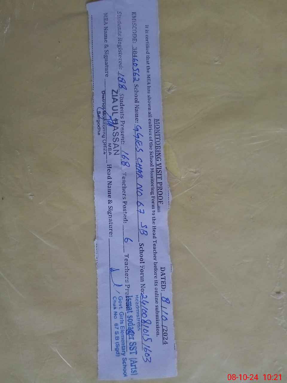 | Monitoring Date: 08-10-2024 | Start Time: 08-10-2024 09:36 AM | End Time: 08-10-2024 10:21 AM | Name of MEA: ZI**** ULHA**** | |