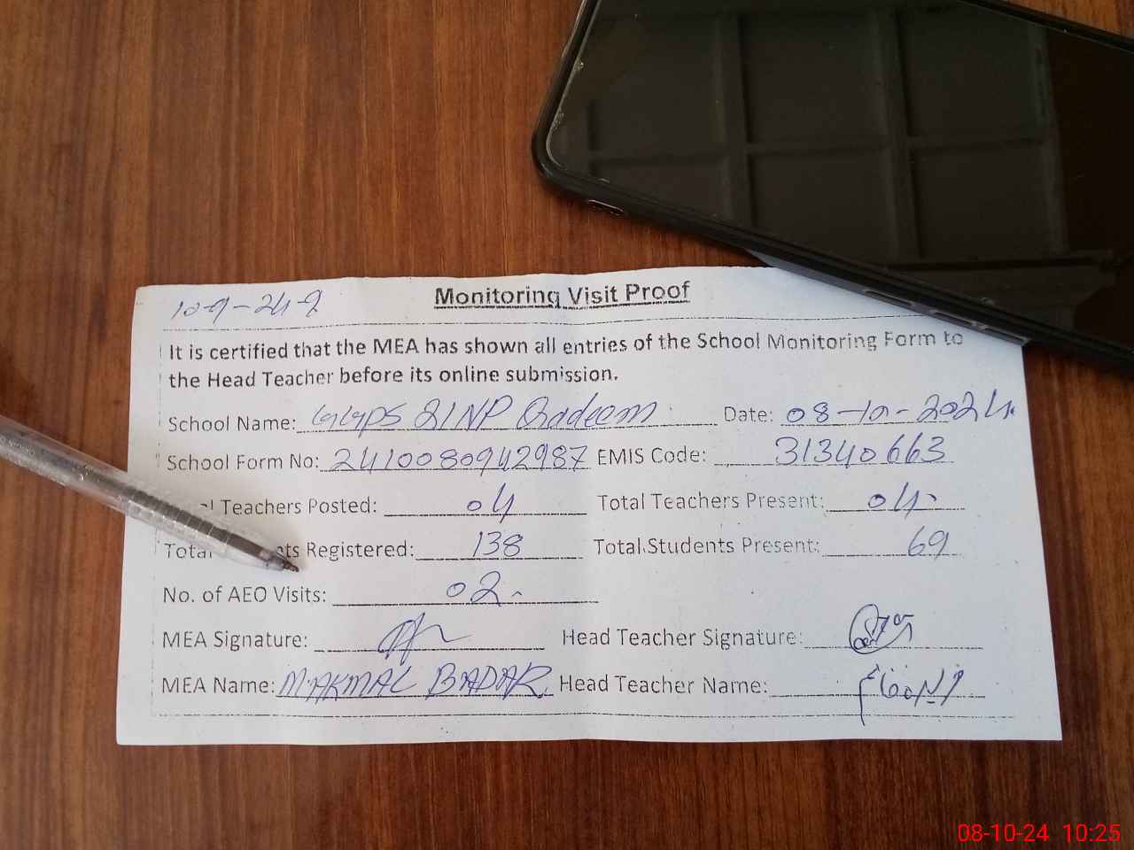 | Attendance Register | Head Teacher | MEA with School | Visit Proof |