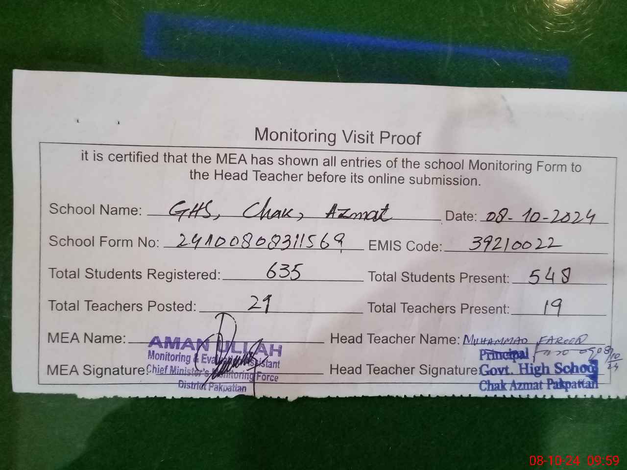| EMIS Code: 39210022 | Name of School: GHS CHAK AZMAT | |||