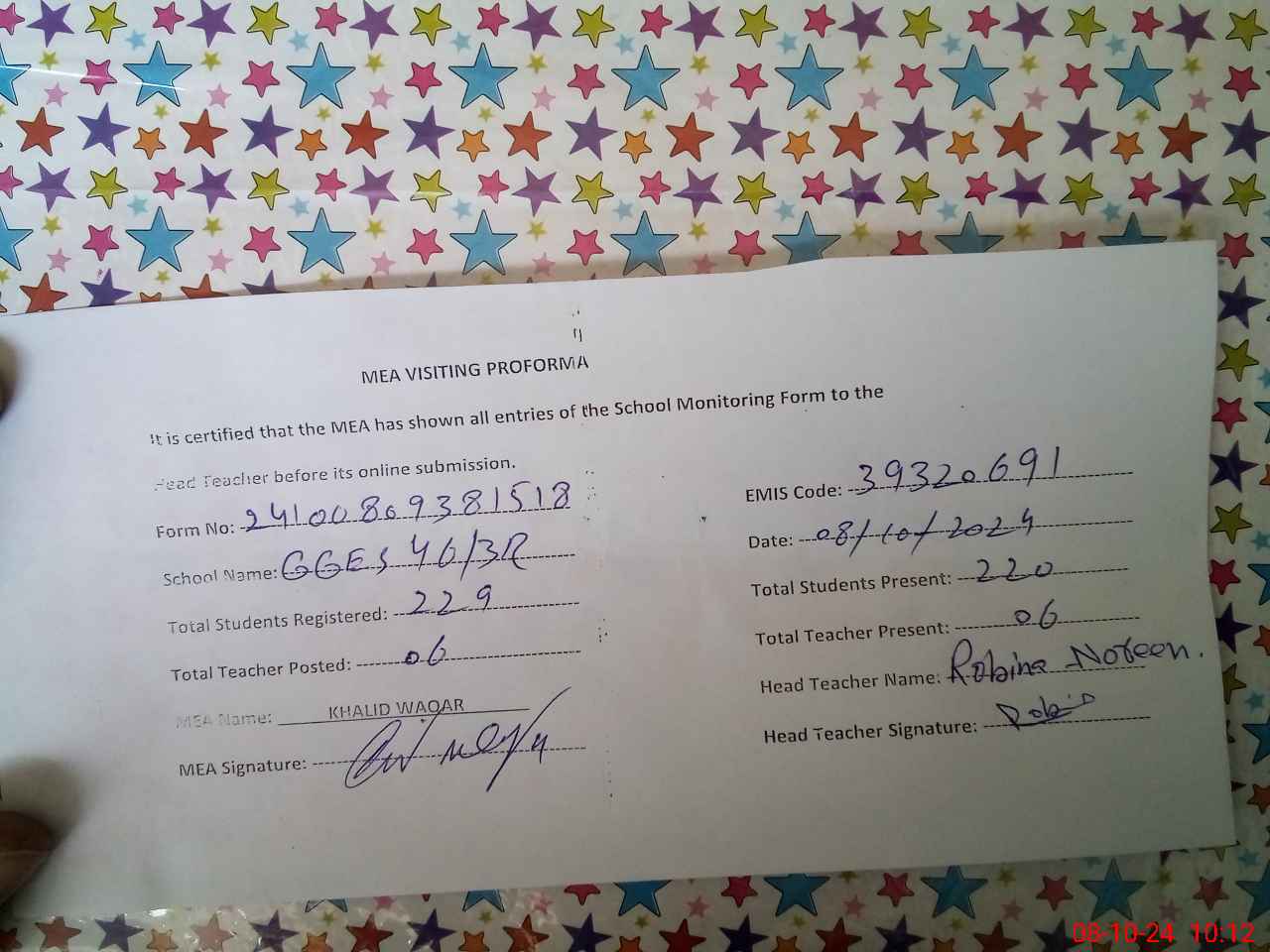 | Monitoring Date: 08-10-2024 | Start Time: 08-10-2024 09:33 AM | End Time: 08-10-2024 10:13 AM | Name of MEA: KH**** WA**** | |