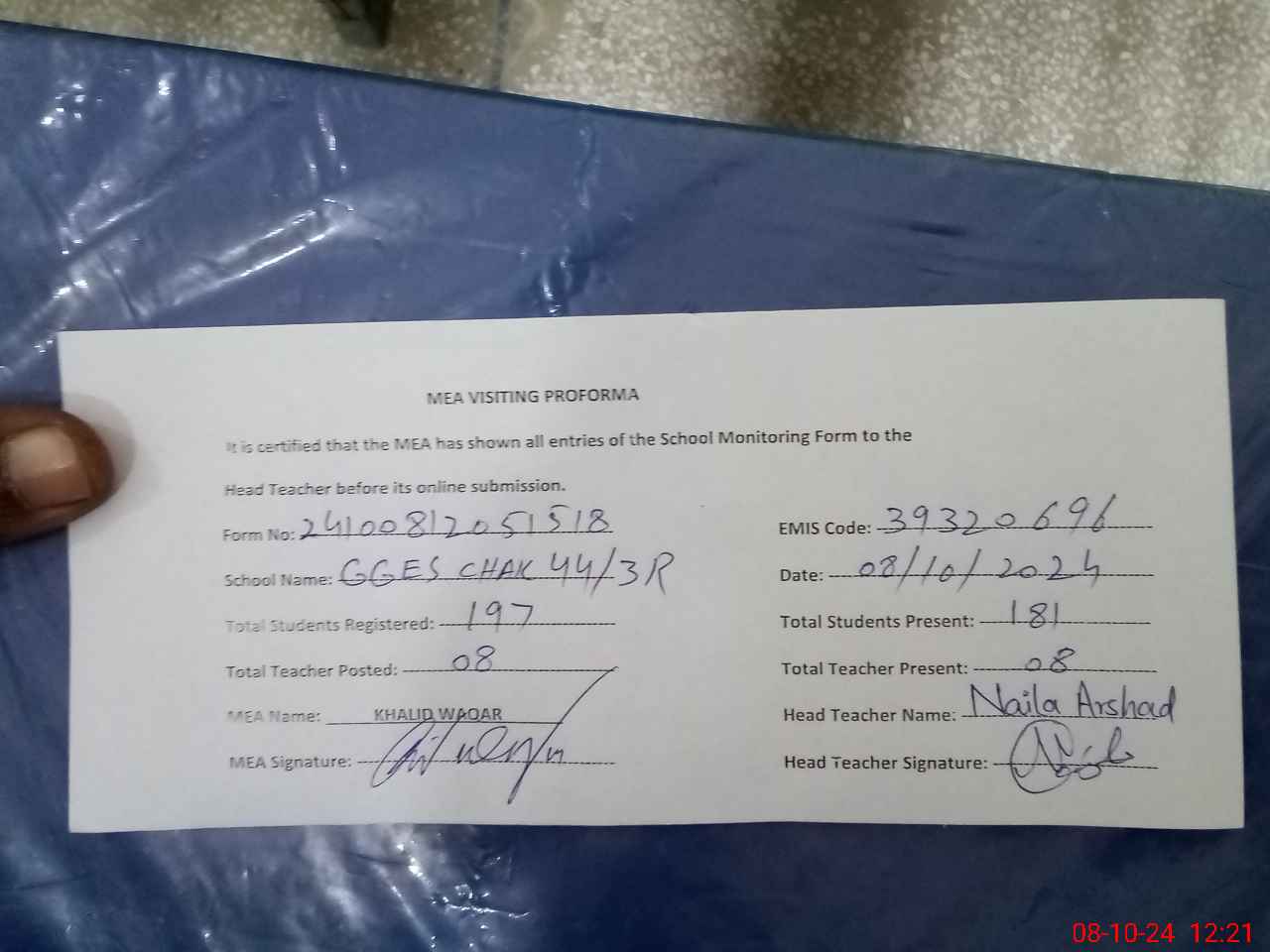 | EMIS Code: 39320696 | Name of School: GGES CHAK NO. 44/3-R | |||