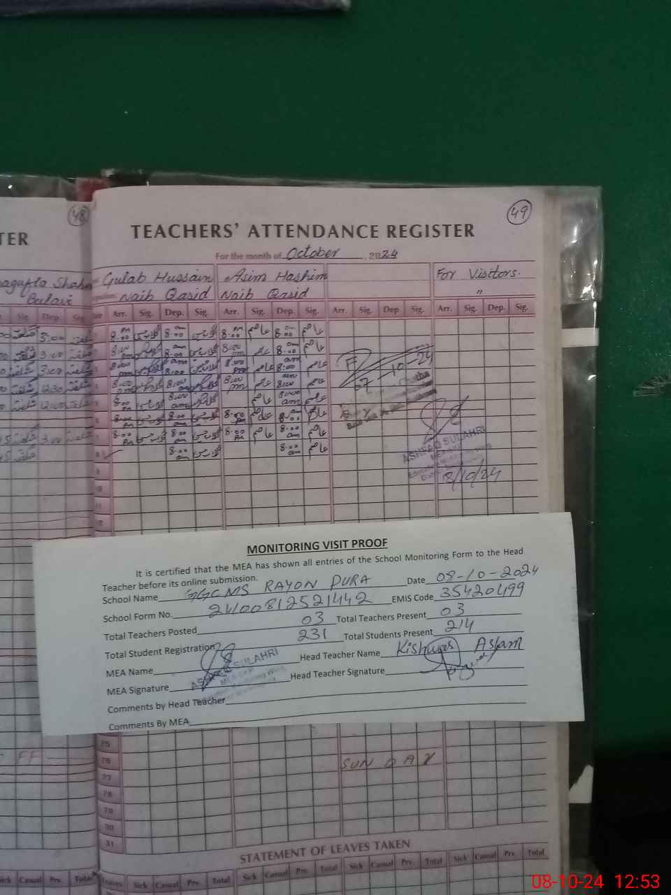 | Attendance Register | Head Teacher | MEA with School | Visit Proof |