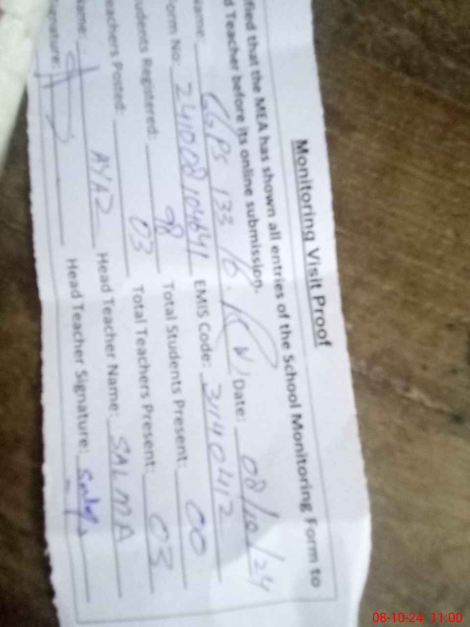 | Attendance Register | Head Teacher | MEA with School | Visit Proof |