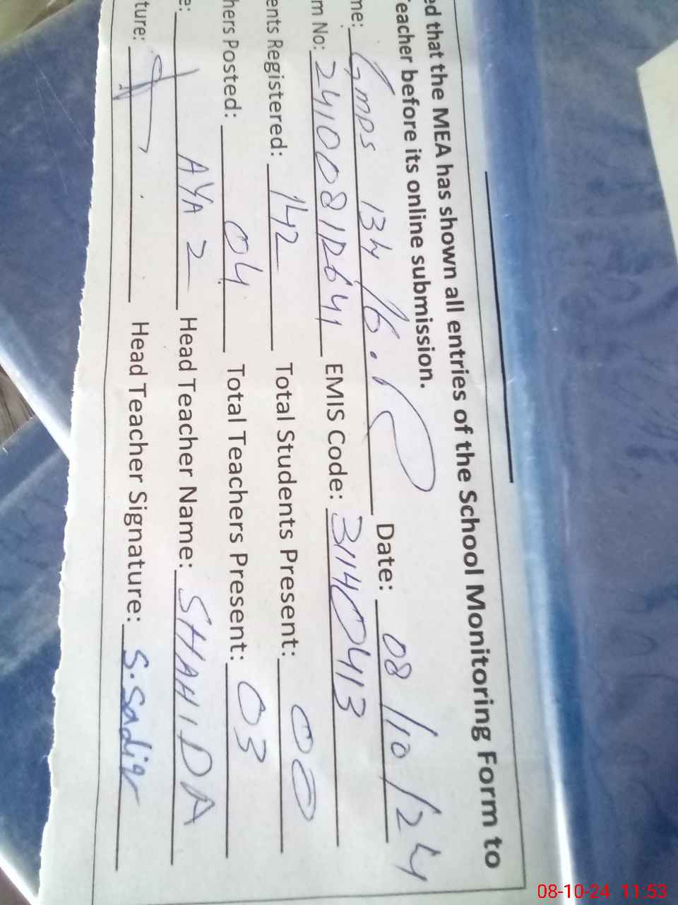 | Name: Na**** Sh**** Designation: (School Headmaster's/Headmistress's) PST Phone/Cell Number: 03**** |