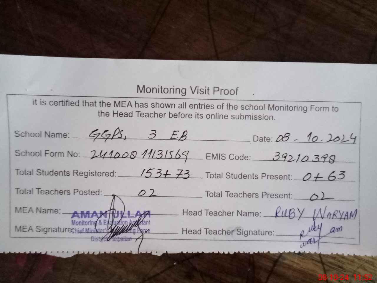| Attendance Register | Head Teacher | MEA with School | Visit Proof |