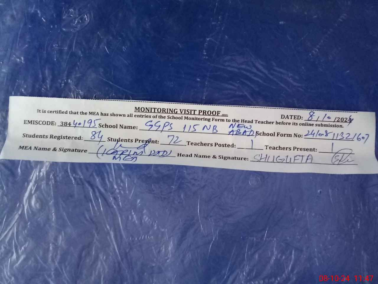| Monitoring Date: 08-10-2024 | Start Time: 08-10-2024 11:32 AM | End Time: 08-10-2024 11:47 AM | Name of MEA: KA**** DA**** | |