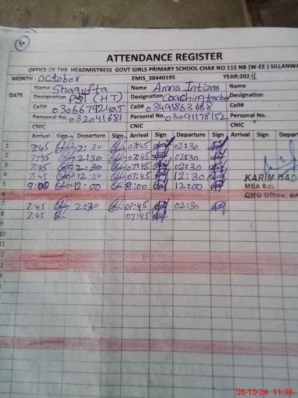 | Name: SH**** Designation: (School Headmaster's/Headmistress's) PST (ARTS) Phone/Cell Number: 03**** |