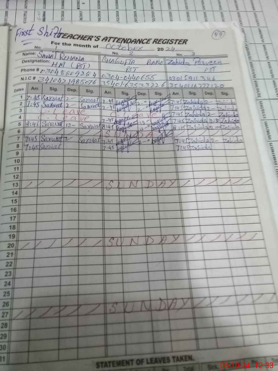 | CNIC | Full Name | Designation | R/C | Absence During Last Calender Month |