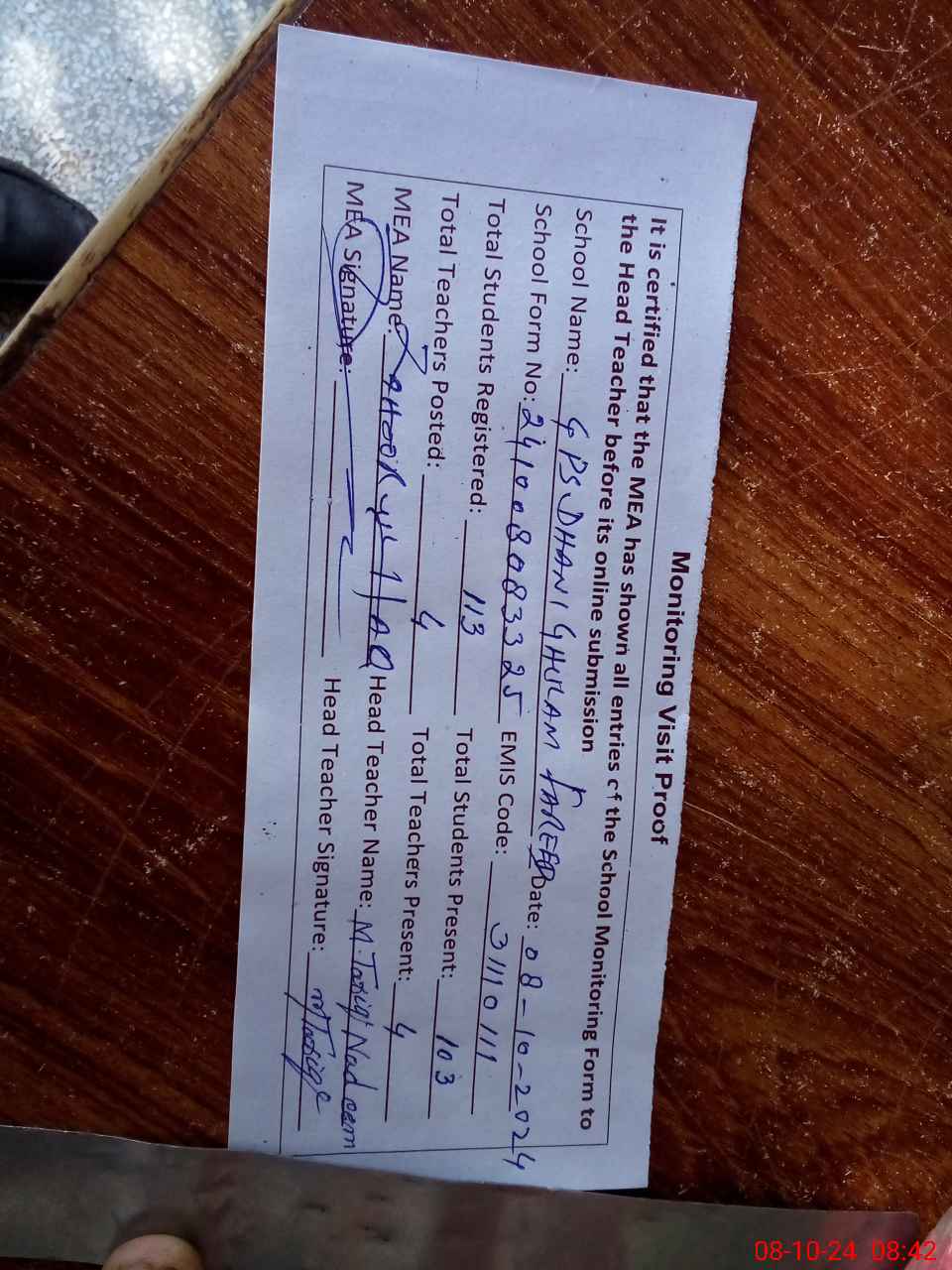 | Attendance Register | Head Teacher | MEA with School | Visit Proof |
