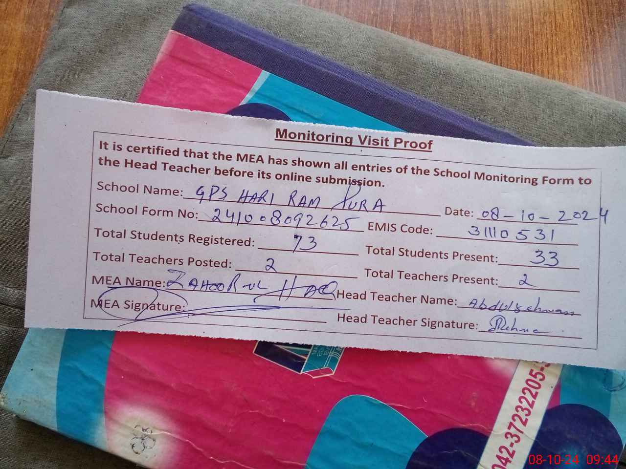 | Attendance Register | Head Teacher | MEA with School | Visit Proof |