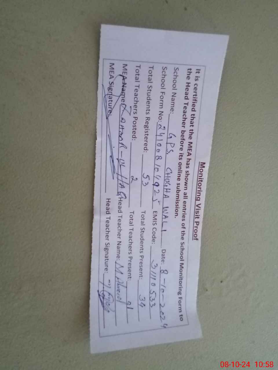 | Attendance Register | Head Teacher | MEA with School | Visit Proof |