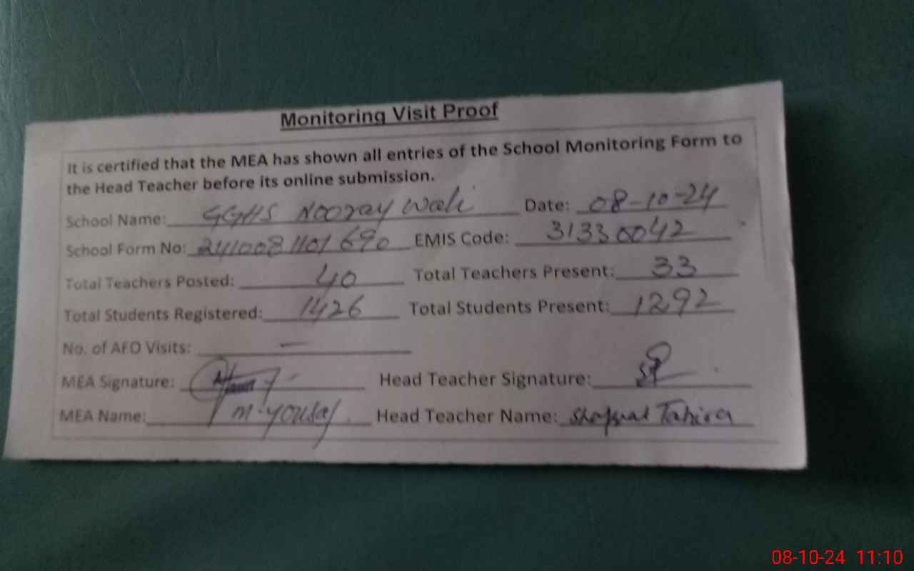| EMIS Code: 31330042 | Name of School: GGHS NOORAY WALI | |||