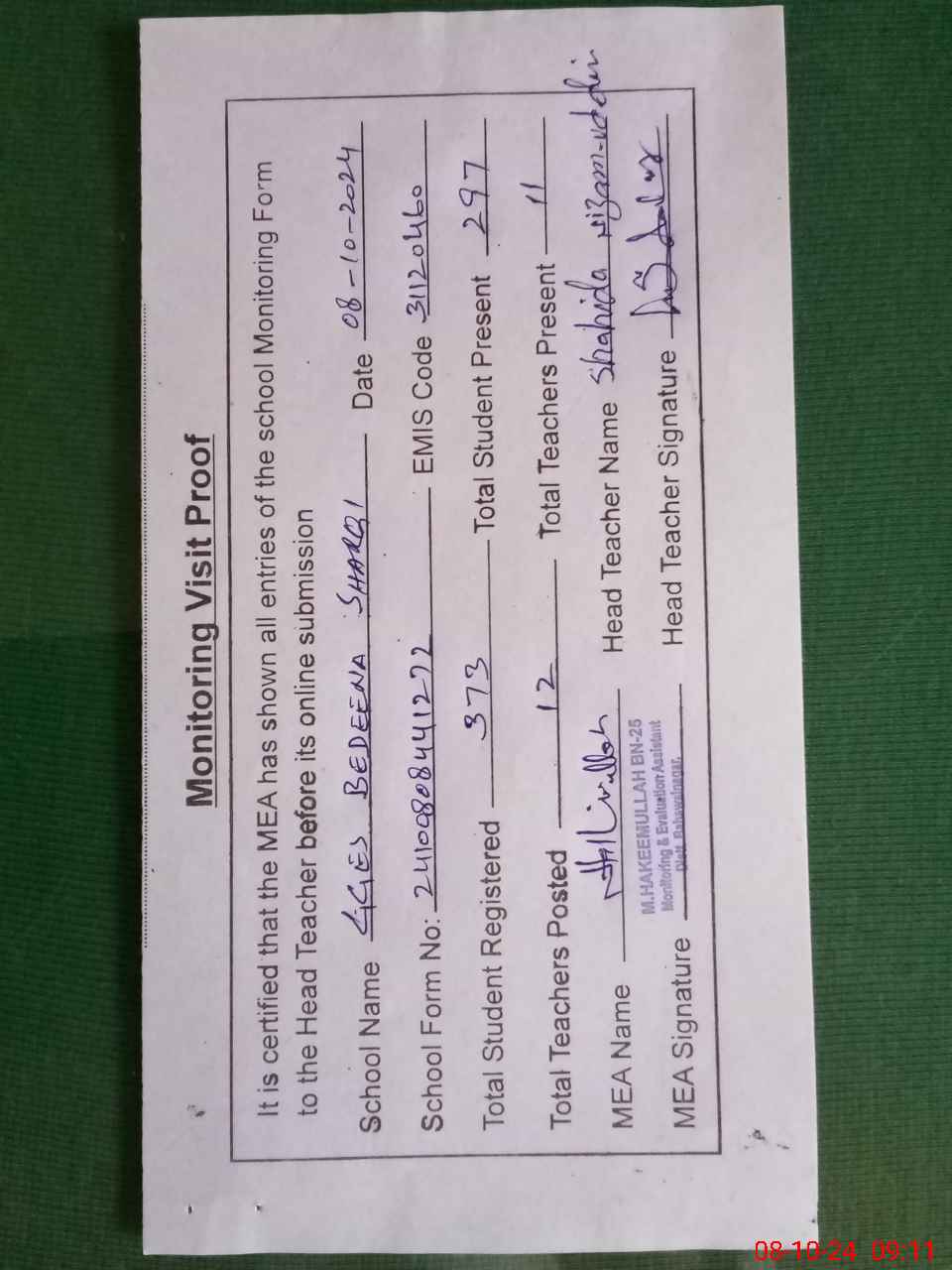 | Monitoring Date: 08-10-2024 | Start Time: 08-10-2024 08:44 AM | End Time: 08-10-2024 09:13 AM | Name of MEA: Mu**** ha**** ul**** BN25 | |
