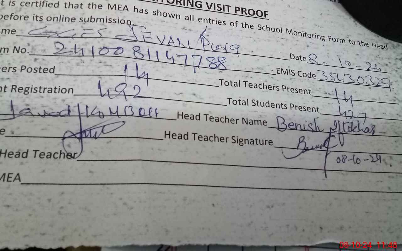| Name: BE**** IF**** Designation: (School Headmaster's/Headmistress's) SST General Phone/Cell Number: 03**** |