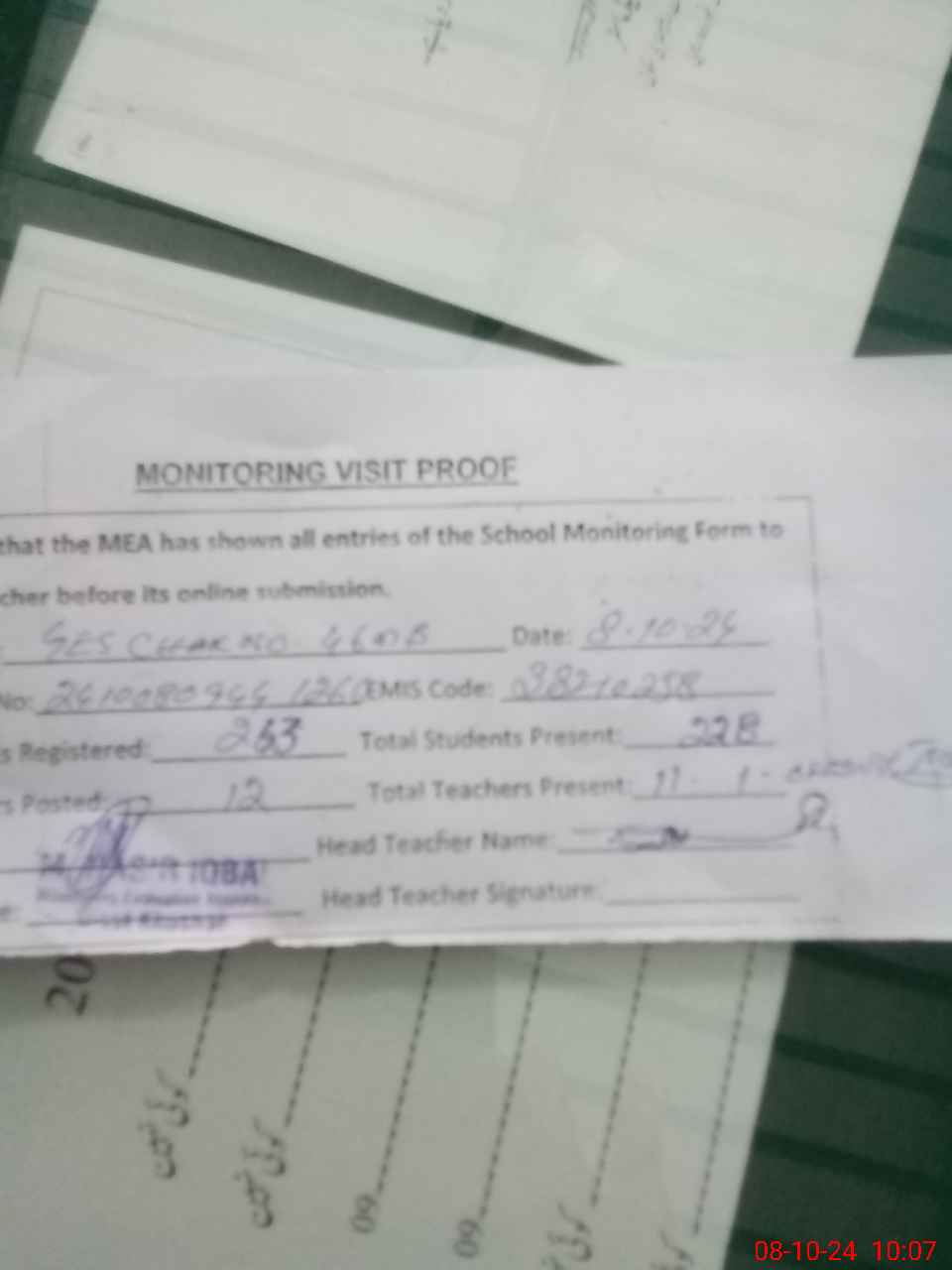 | Attendance Register | Head Teacher | MEA with School | Visit Proof |