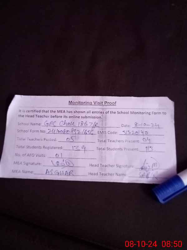 | Attendance Register | Head Teacher | MEA with School | Visit Proof |