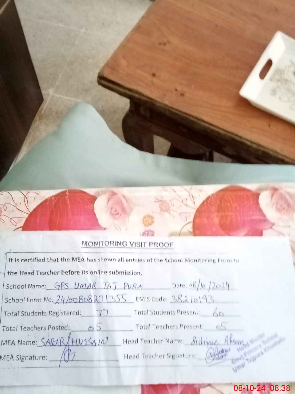 | Certified that this School was Inspected by the Undersigned MEA/DMO Today and the Information Stated Above is as Per Record. | |||||