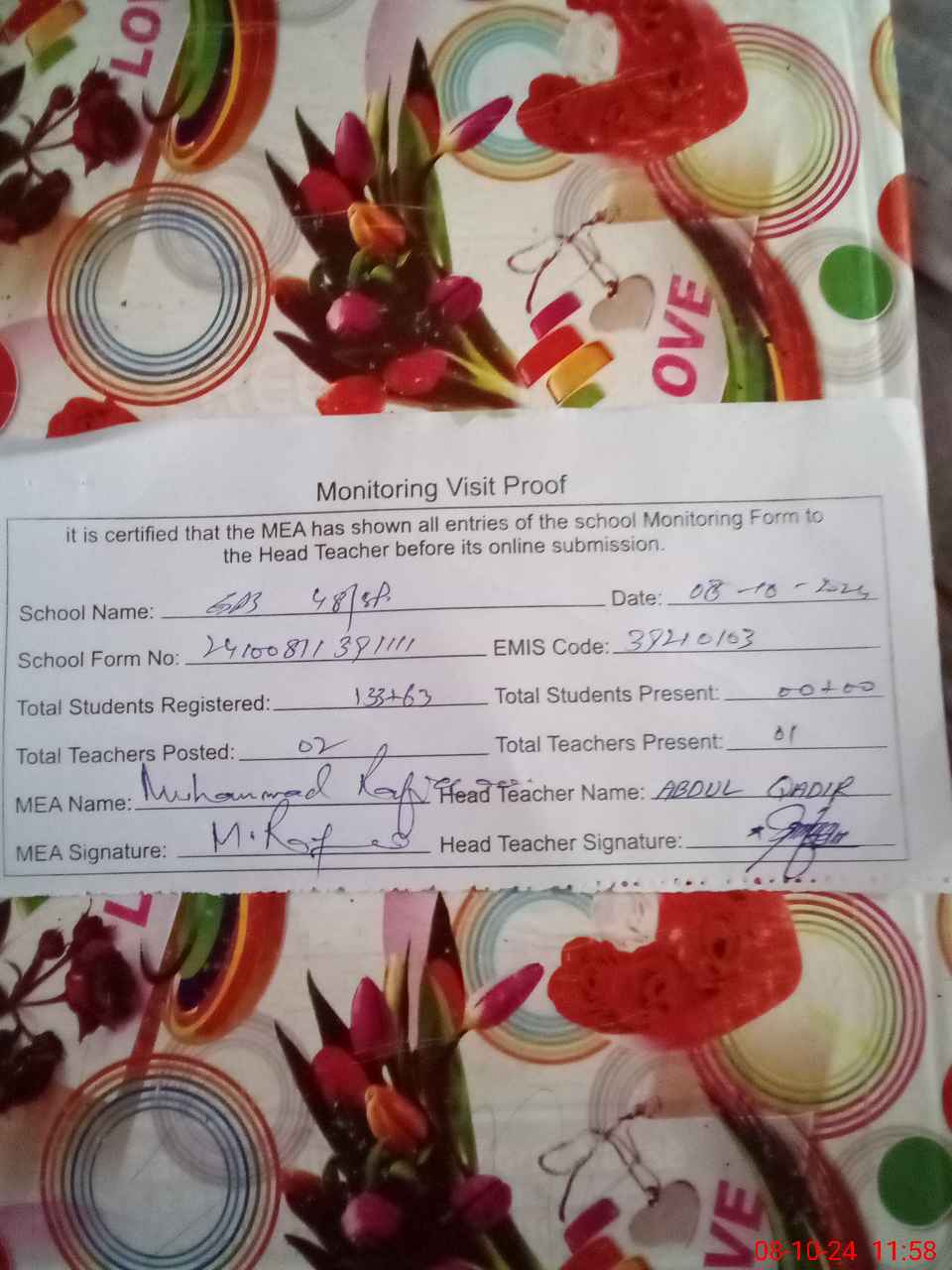 | Attendance Register | Head Teacher | MEA with School | Visit Proof |
