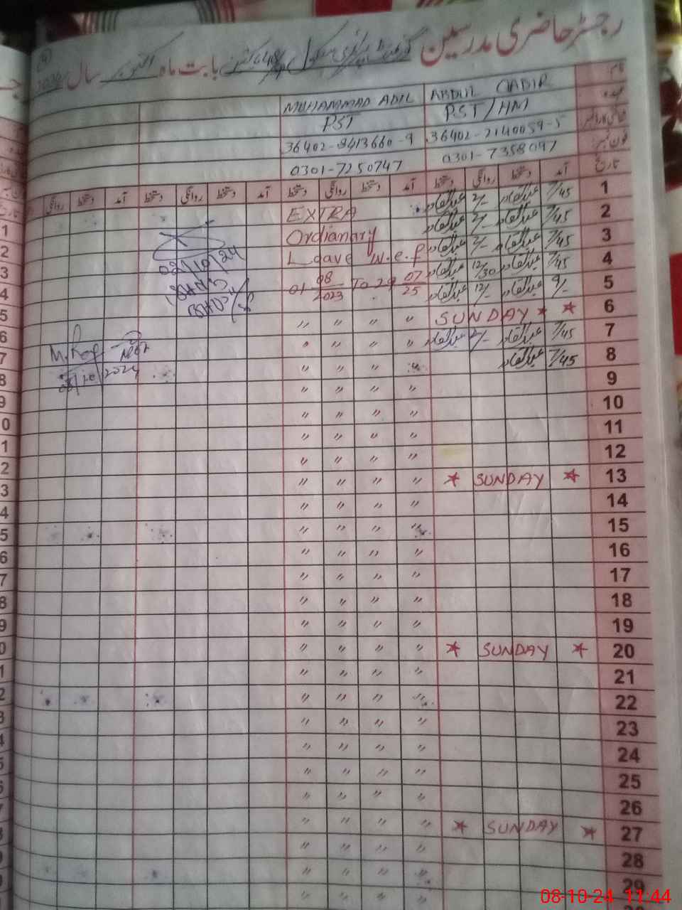 | CNIC | Full Name | Designation | R/C | Absence During Last Calender Month |