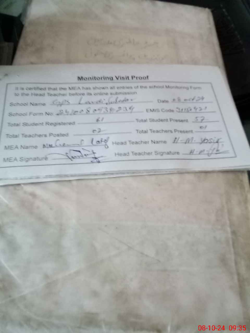 | Attendance Register | Head Teacher | MEA with School | Visit Proof |