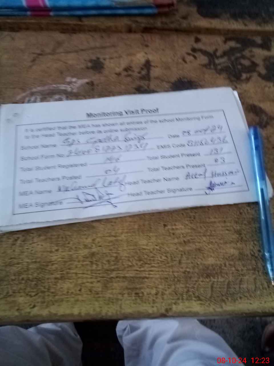 | Attendance Register | Head Teacher | MEA with School | Visit Proof |