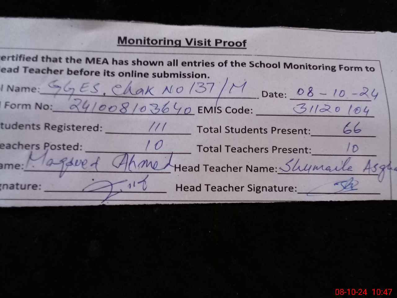 | Name: SH**** AS**** Designation: (School Headmaster's/Headmistress's) S.s T Arts Phone/Cell Number: 03**** |