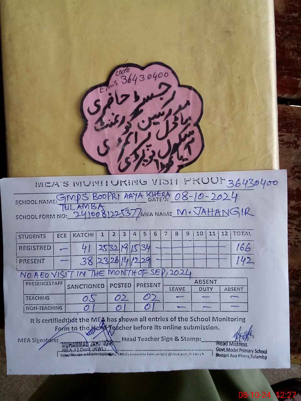 | EMIS Code: 36430400 | Name of School: GMPS BOOPRI AYA KHERA, TULAMBA | |||