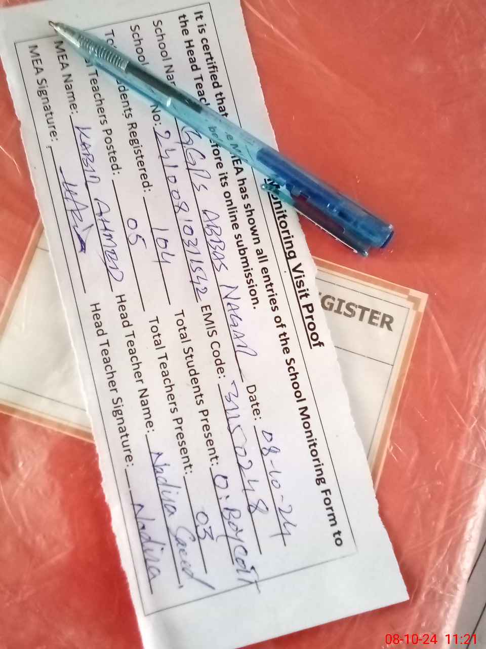 | Attendance Register | Head Teacher | MEA with School | Visit Proof |