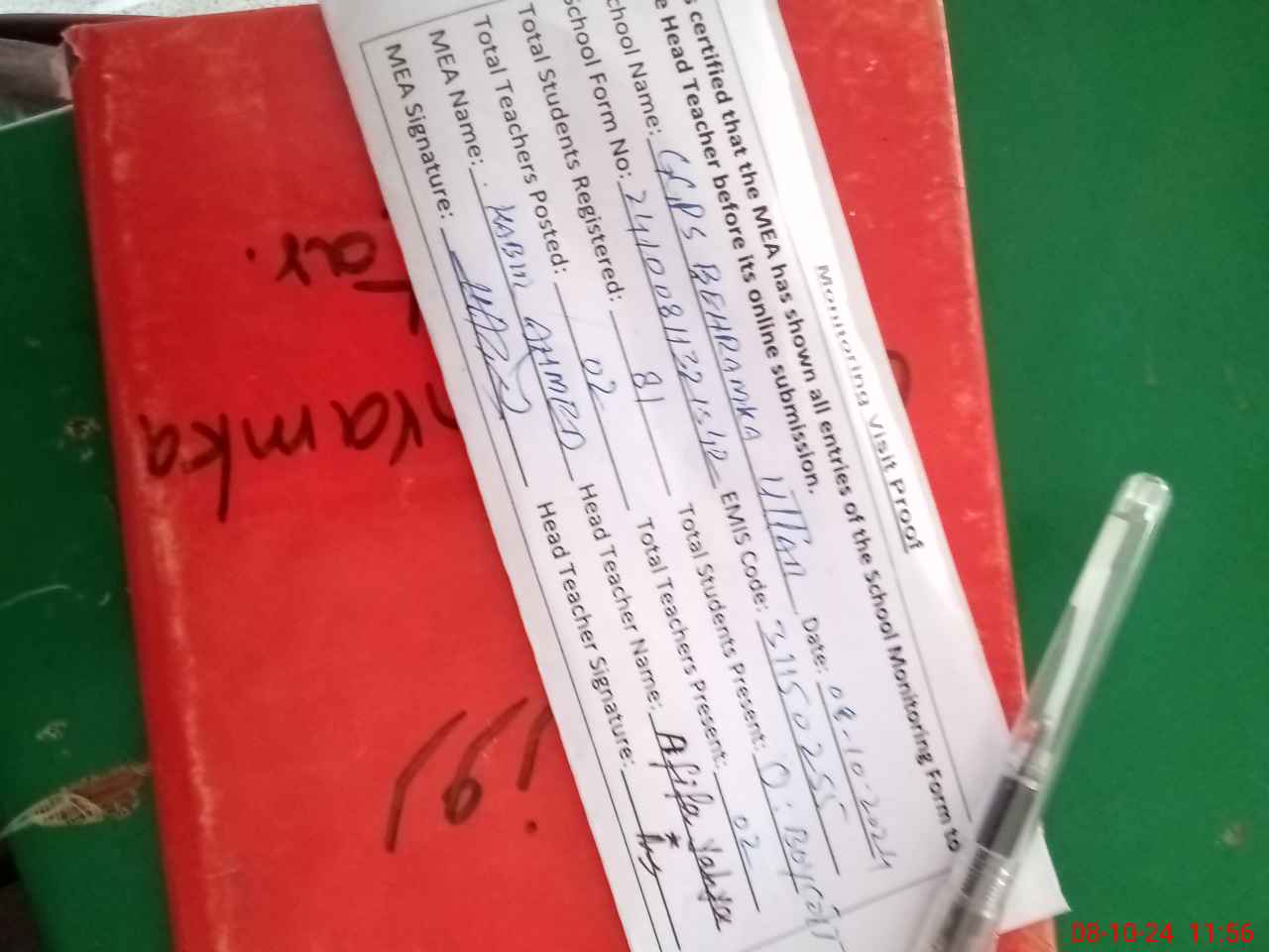 | Attendance Register | Head Teacher | MEA with School | Visit Proof |