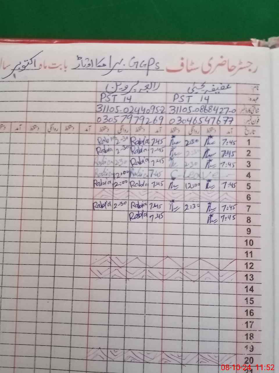 | CNIC | Full Name | Designation | R/C | Absence During Last Calender Month |