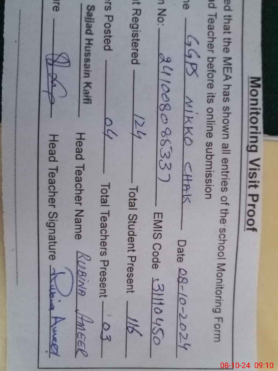 | Monitoring Date: 08-10-2024 | Start Time: 08-10-2024 08:52 AM | End Time: 08-10-2024 09:19 AM | Name of MEA: Sa**** Hu**** Ka**** BN**** 17 | |