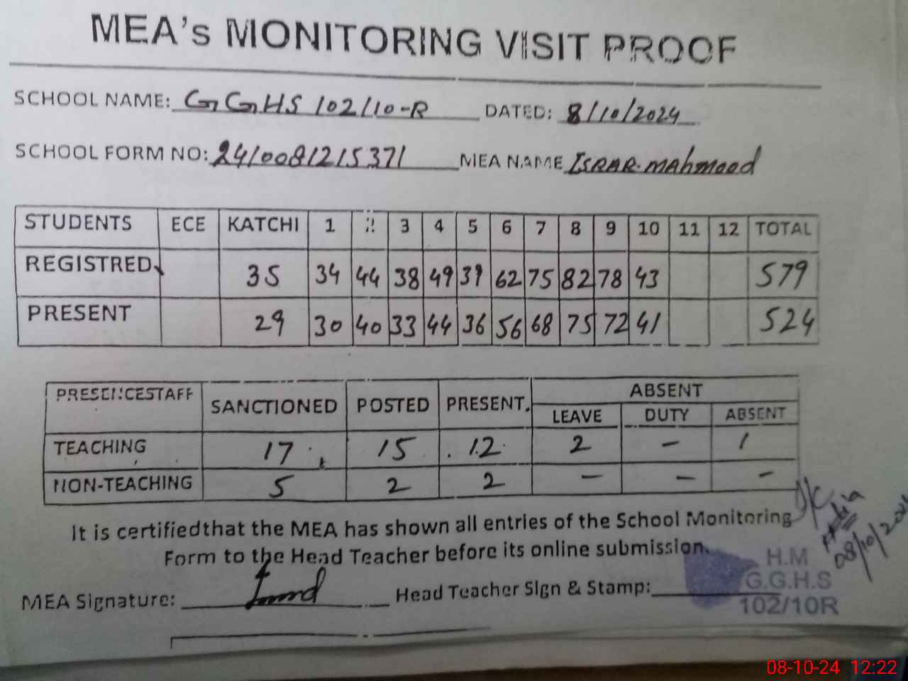 | Attendance Register | Head Teacher | MEA with School | Visit Proof |
