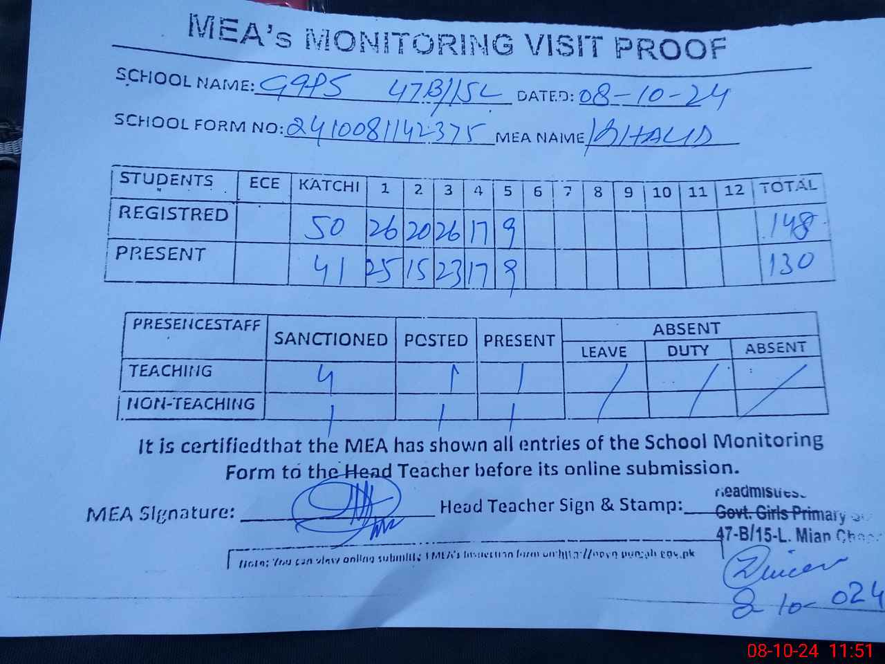 | EMIS Code: 36430339 | Name of School: GGPS 47-B/15-L, MIAN CHANNU | |||