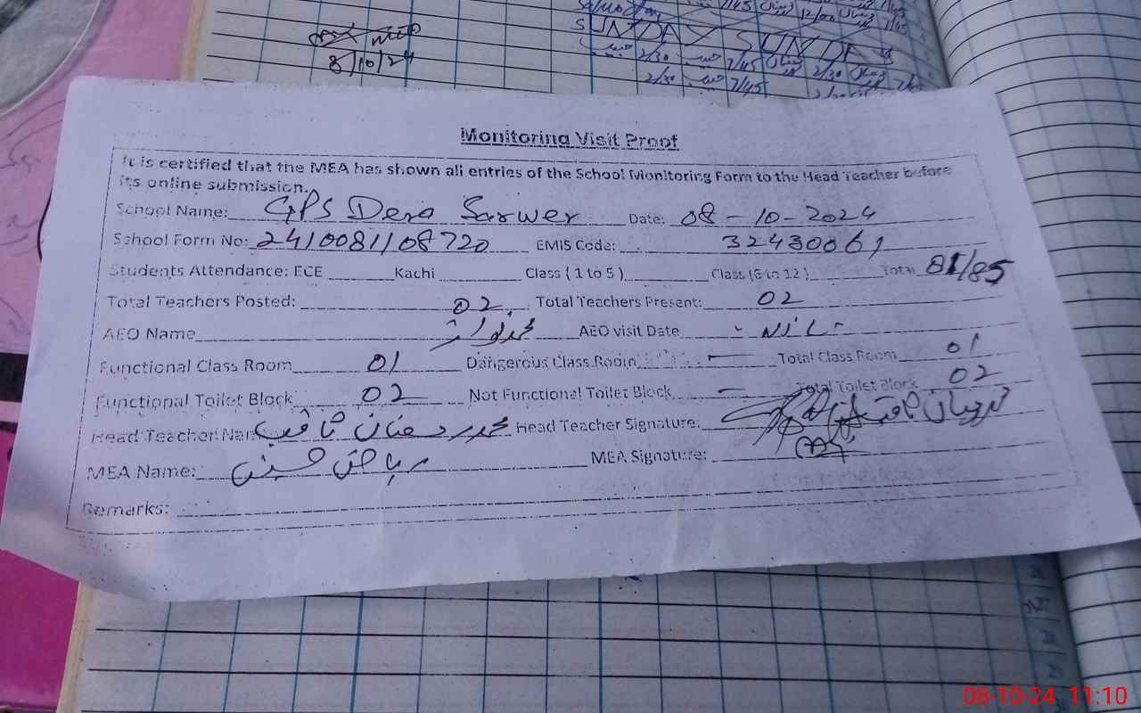 | EMIS Code: 32430061 | Name of School: GPS DERA SARWAR | |||