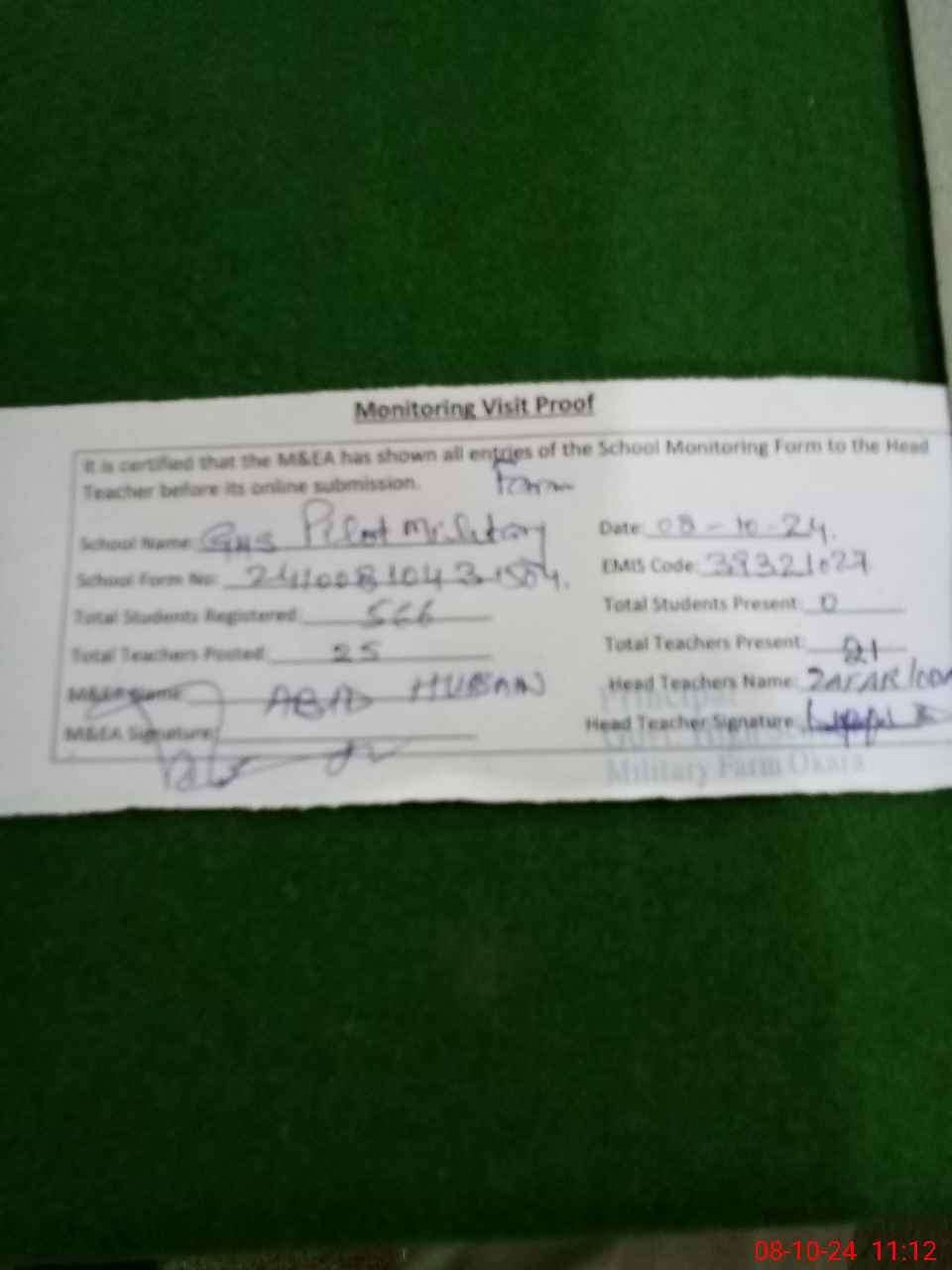 | Certified that this School was Inspected by the Undersigned MEA/DMO Today and the Information Stated Above is as Per Record. | |||||