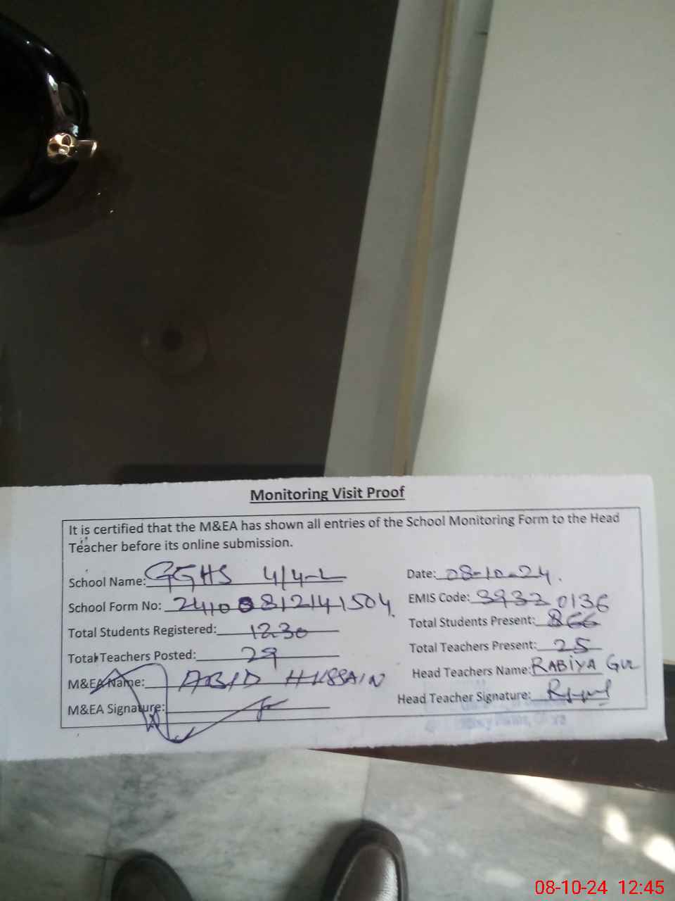 | Attendance Register | Head Teacher | MEA with School | Visit Proof |