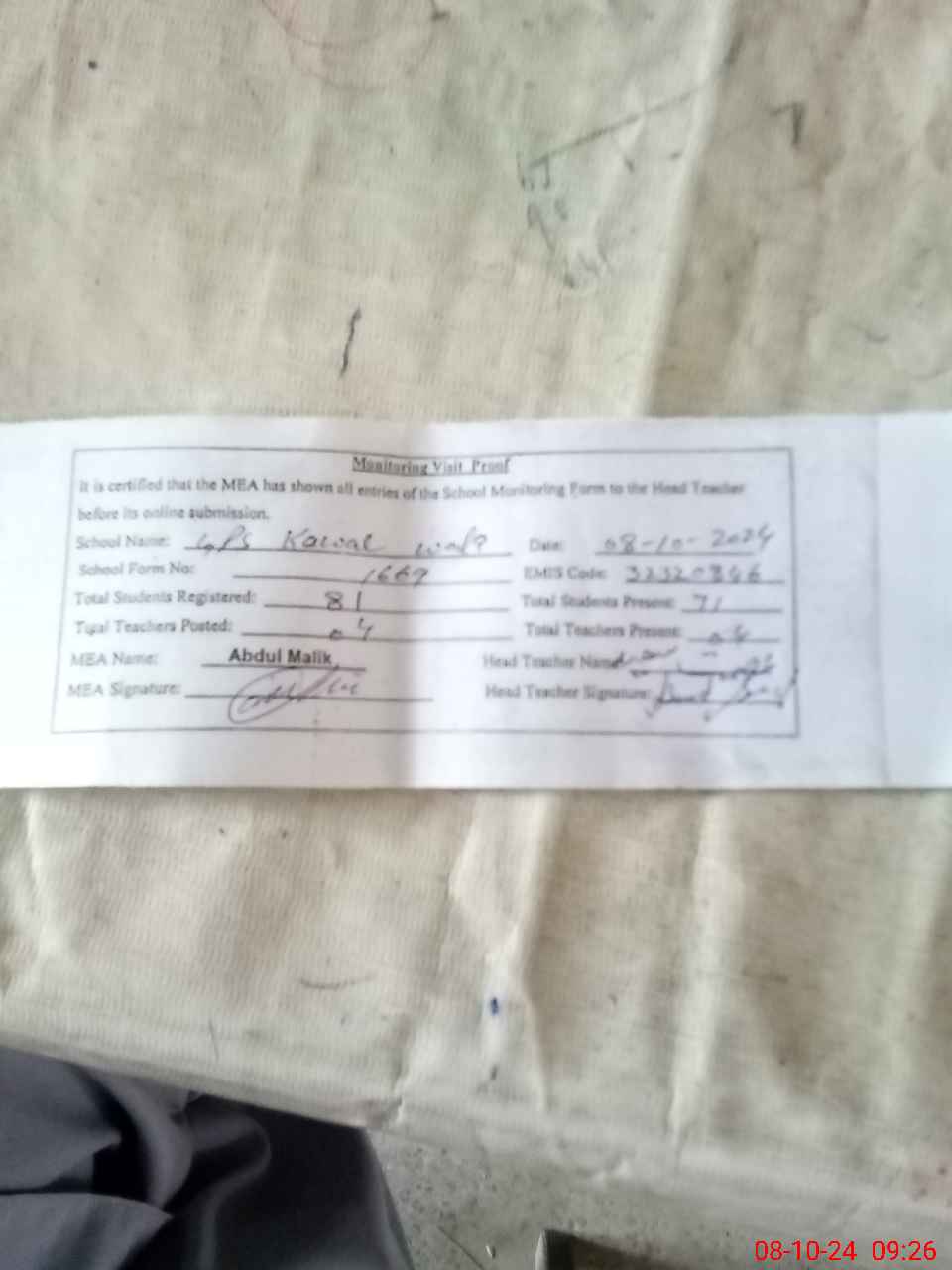 | Attendance Register | Head Teacher | MEA with School | Visit Proof |