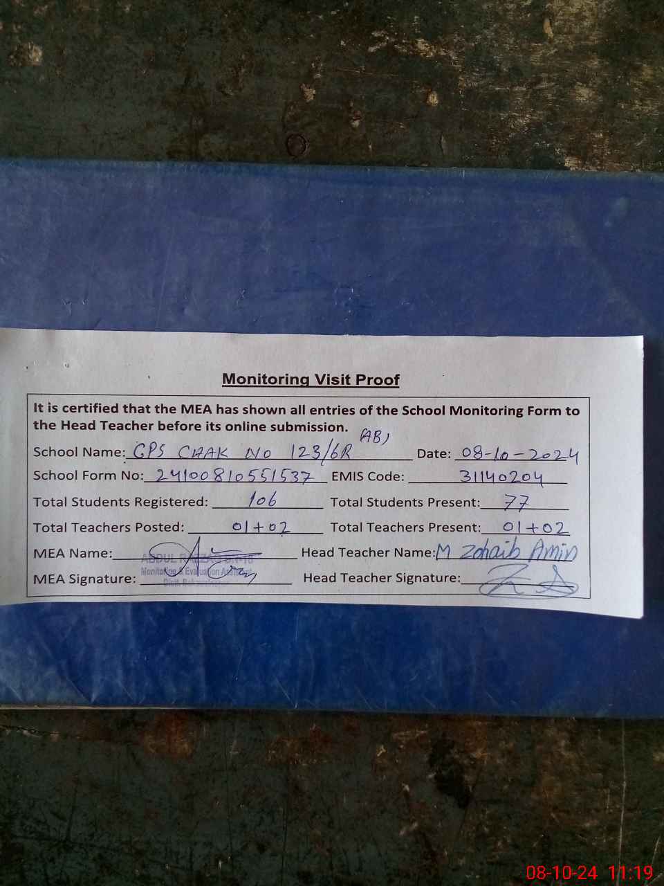 | Attendance Register | Head Teacher | MEA with School | Visit Proof |