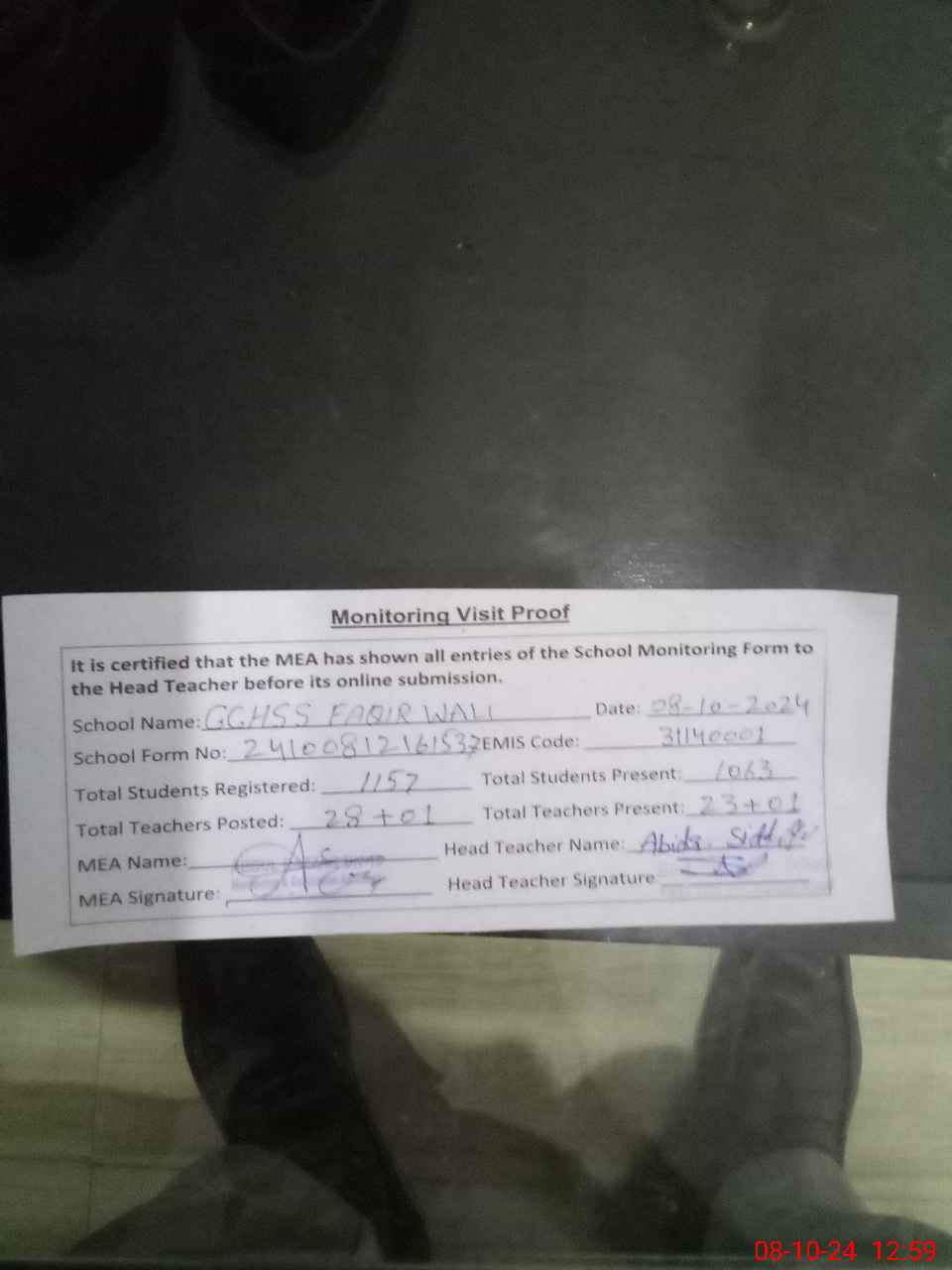 | Attendance Register | Head Teacher | MEA with School | Visit Proof |