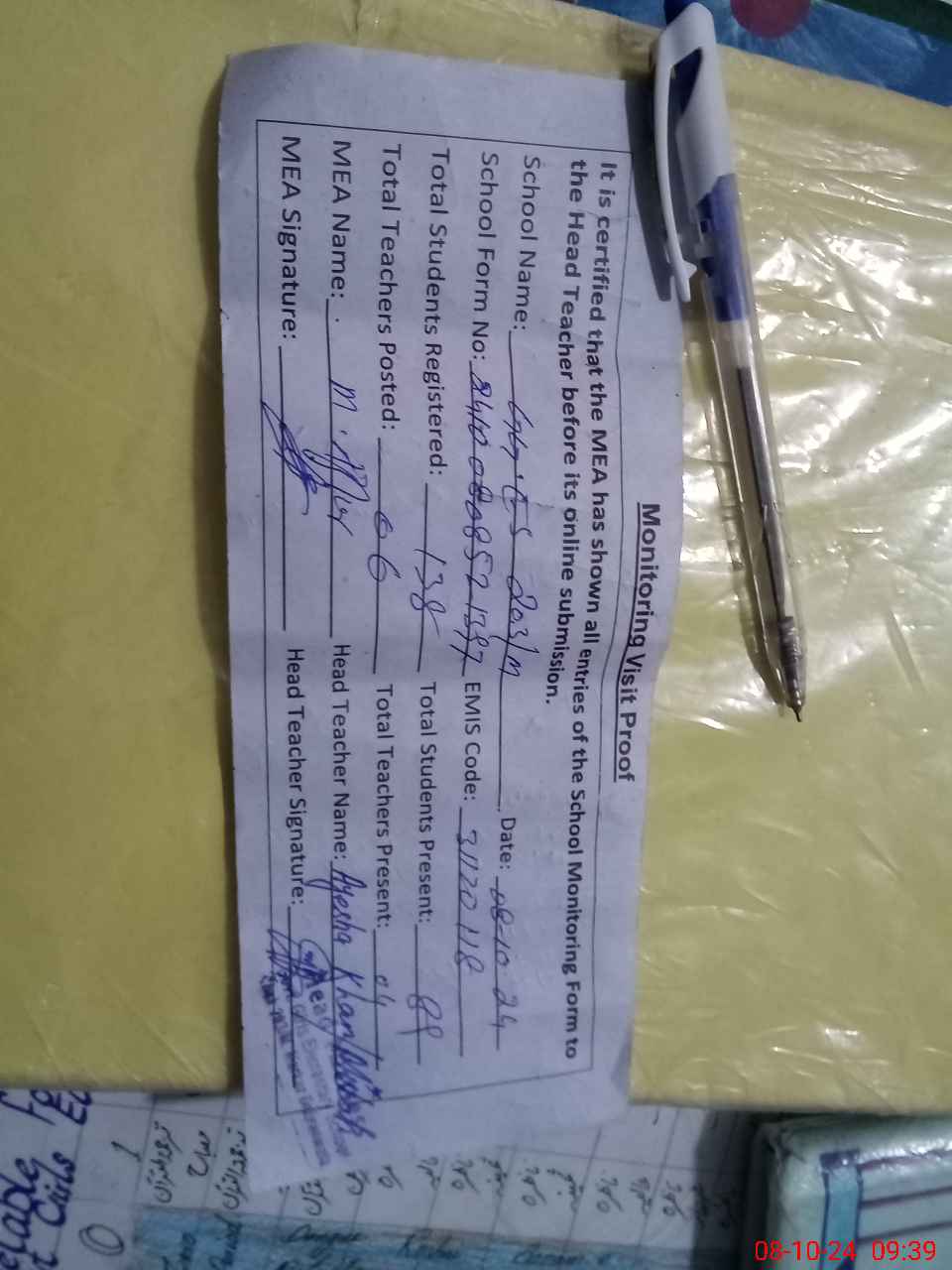 | Attendance Register | Head Teacher | MEA with School | Visit Proof |