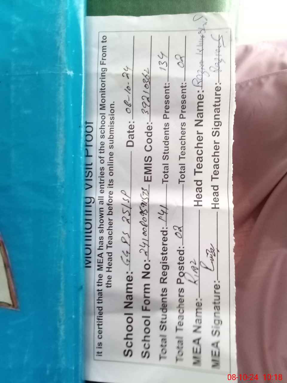 | Certified that this School was Inspected by the Undersigned MEA/DMO Today and the Information Stated Above is as Per Record. | |||||