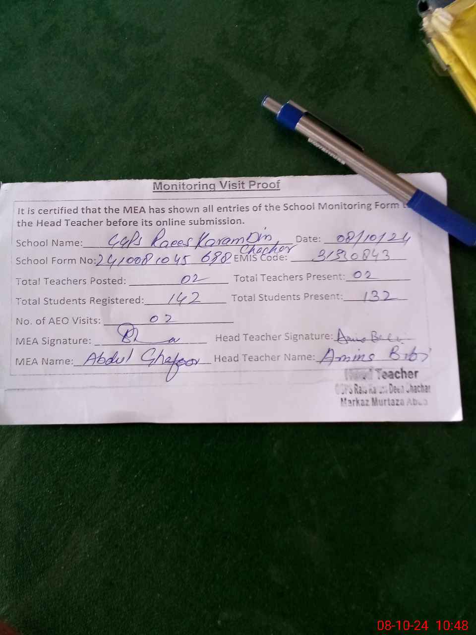 | Attendance Register | Head Teacher | MEA with School | Visit Proof |