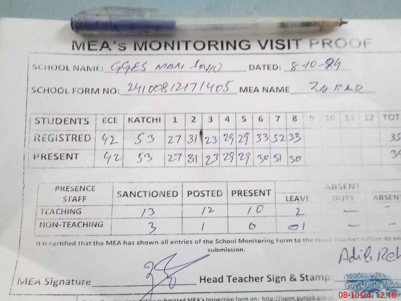 | Attendance Register | Head Teacher | MEA with School | Visit Proof |