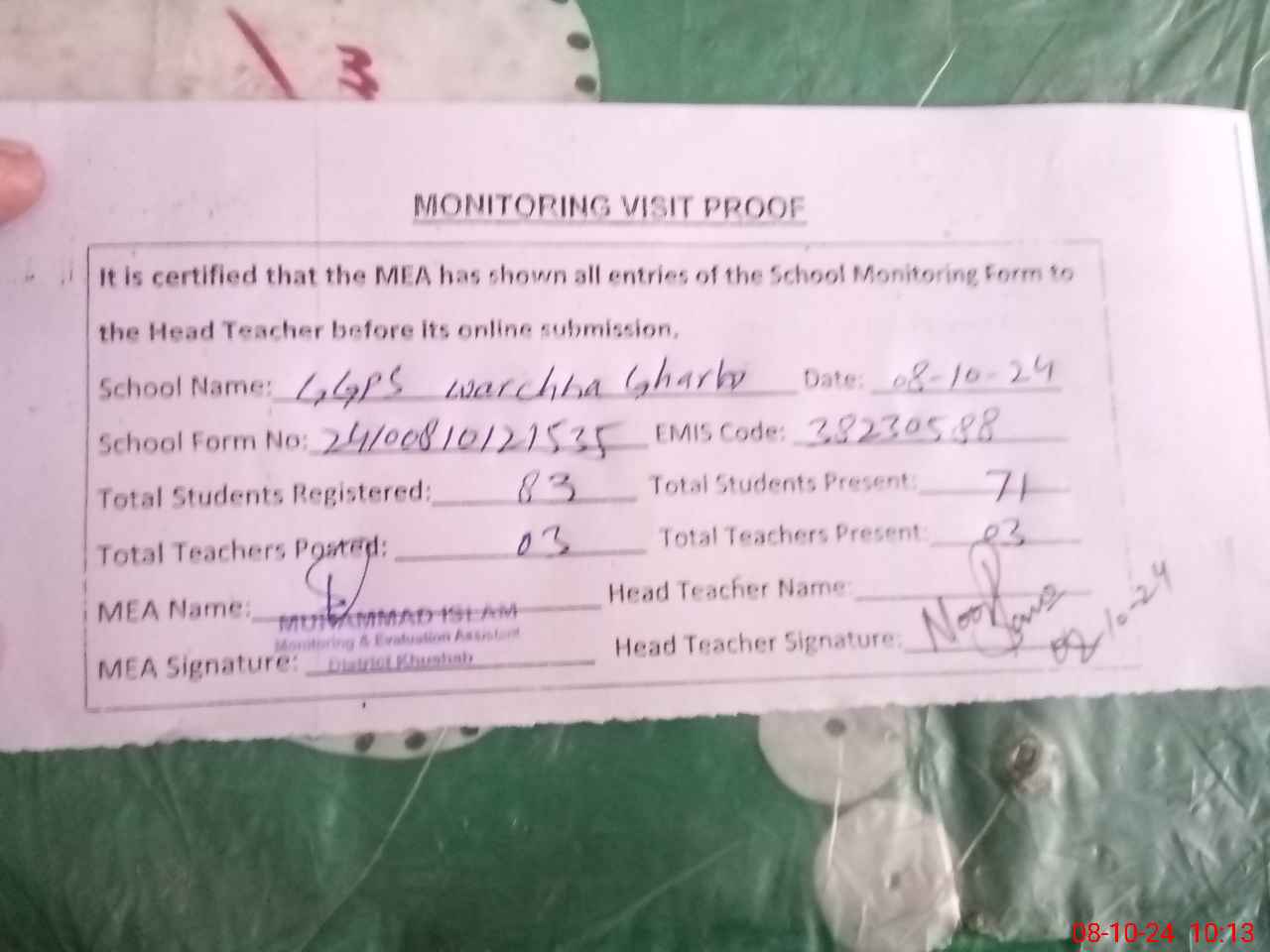 | Attendance Register | Head Teacher | MEA with School | Visit Proof |