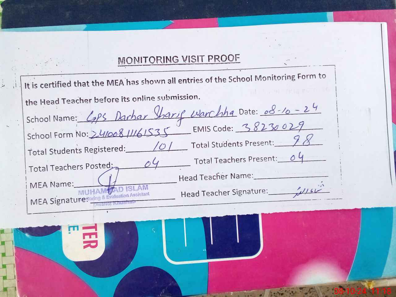 | Attendance Register | Head Teacher | MEA with School | Visit Proof |