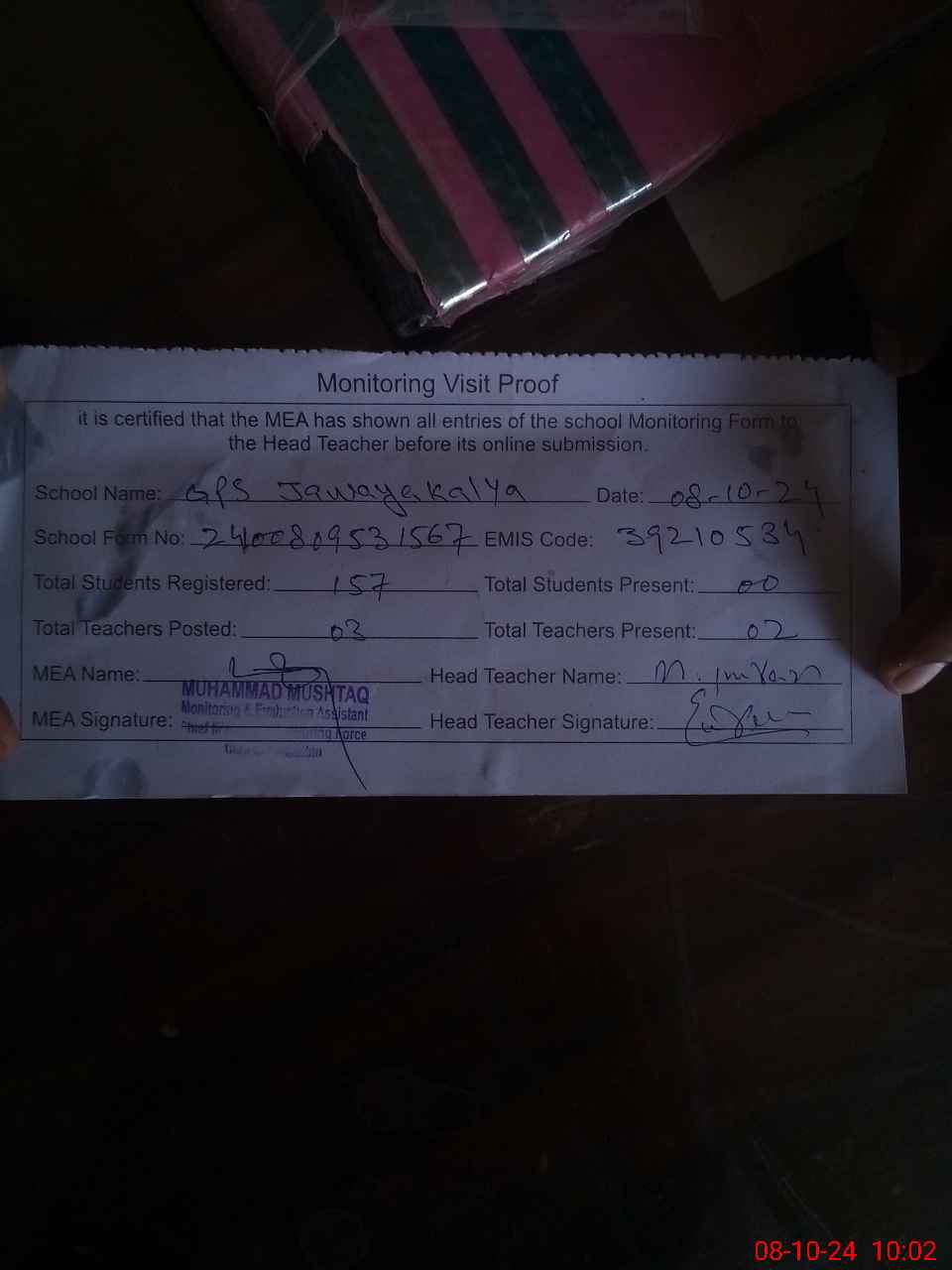 | Attendance Register | Head Teacher | MEA with School | Visit Proof |