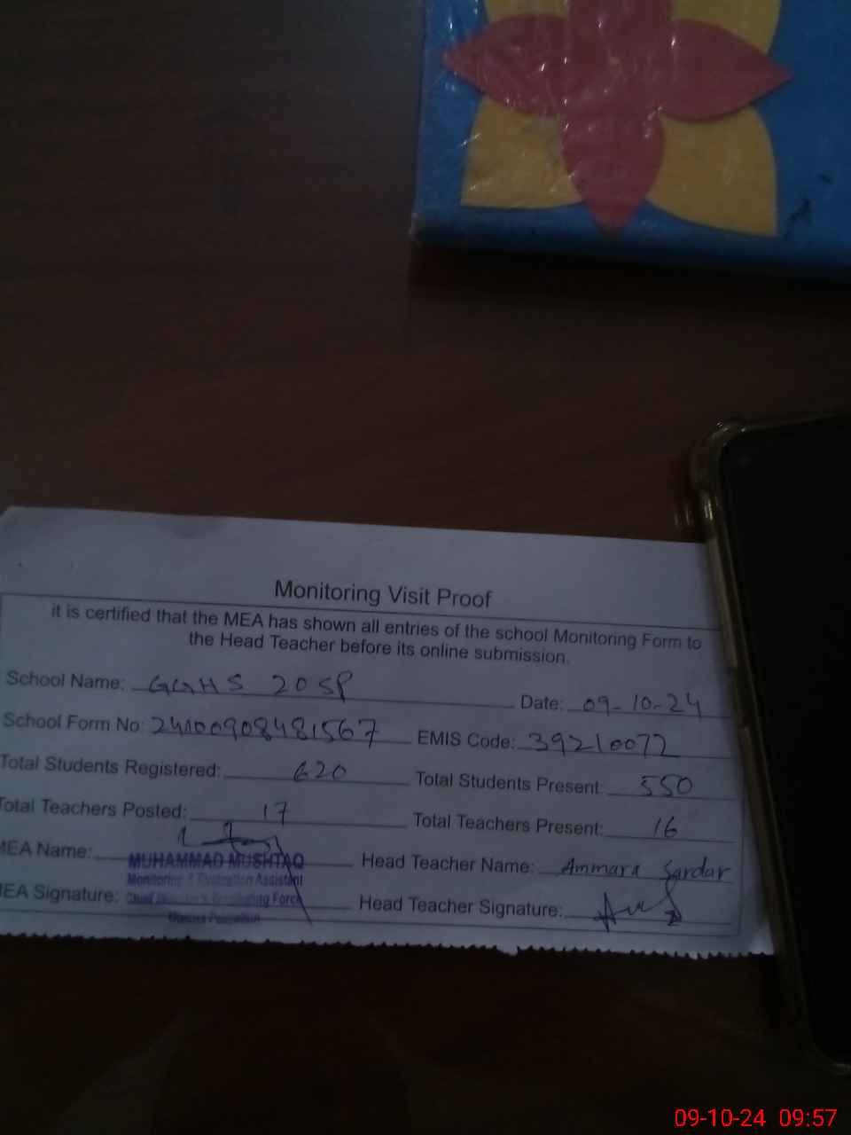 | EMIS Code: 39210072 | Name of School: GGHS 20 SP | |||
