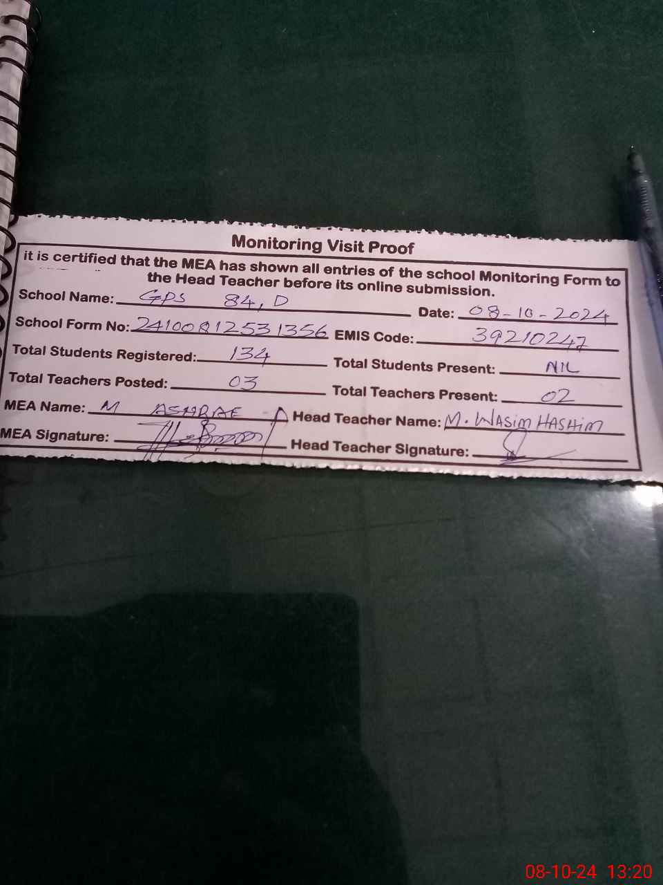 | Attendance Register | Head Teacher | MEA with School | Visit Proof |