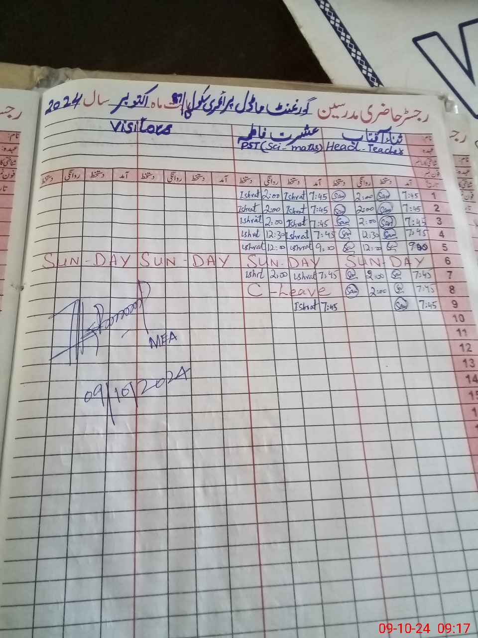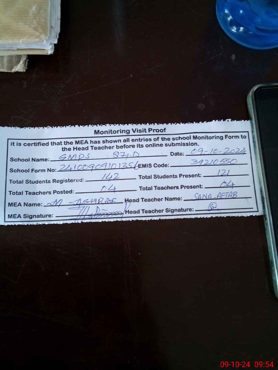 | Attendance Register | Head Teacher | MEA with School | Visit Proof |