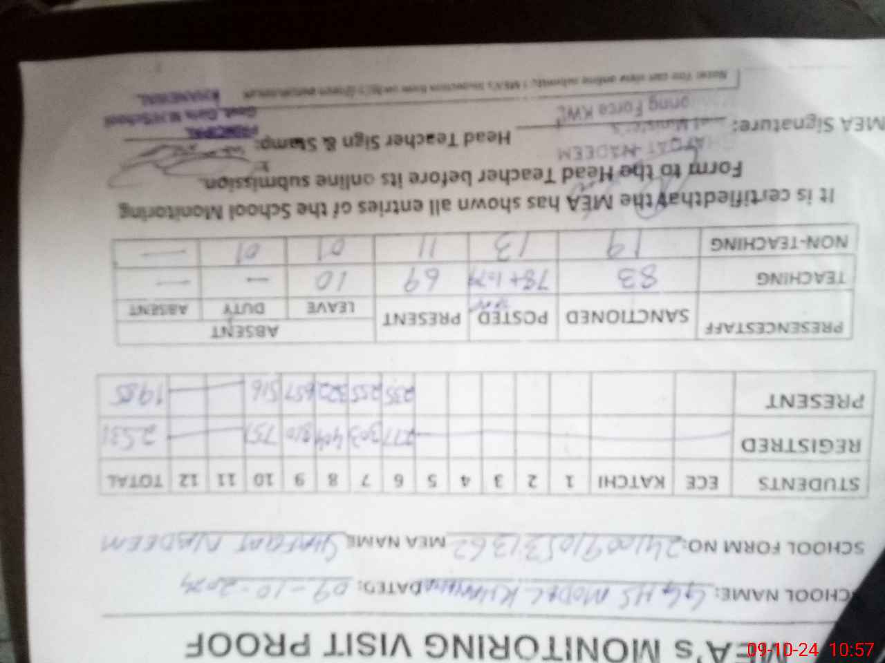 | Attendance Register | Head Teacher | MEA with School | Visit Proof |